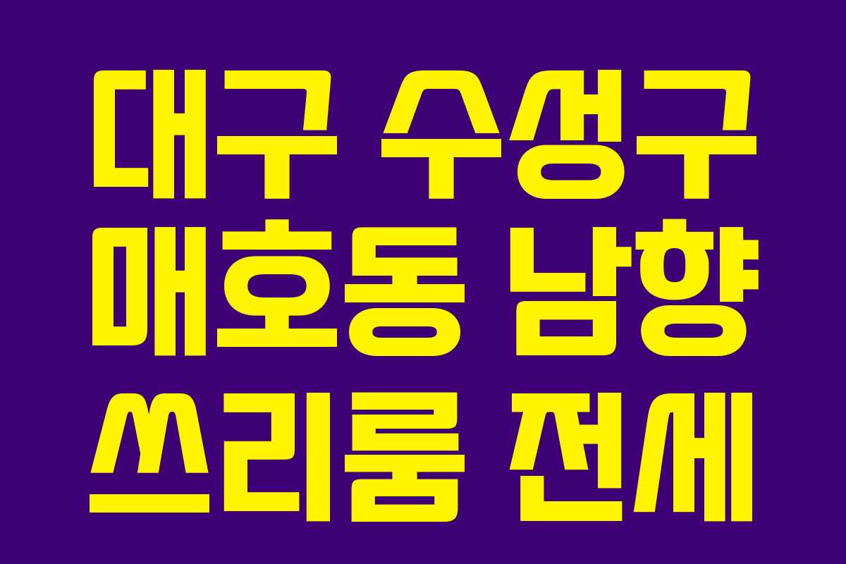 대구 수성구 매호동에 위치한 남향 쓰리룸 전세 매물이 나왔습니다. 보증금은 8천만원이며 월 관리비는 10만원입니다. 이 매물은 방 2개와 거실 1개, 욕실 1개, 발코니 1개로 구성되어 있어 공간 활용이 용이합니다.
