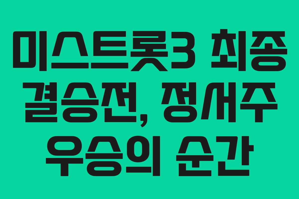 2023년 3월 7일 방송된 미스트롯3 결승전에서 부산 출신의 정서주가 우승의 영예를 안았습니다. 이번 결승전은 ‘나의 인생노래’라는 주제로 진행되었으며, 정서주는 가수 이효정의 ‘우리 어머니’를 열창하여 마스터와 관객들로부터 찬사를 받았습니다.
