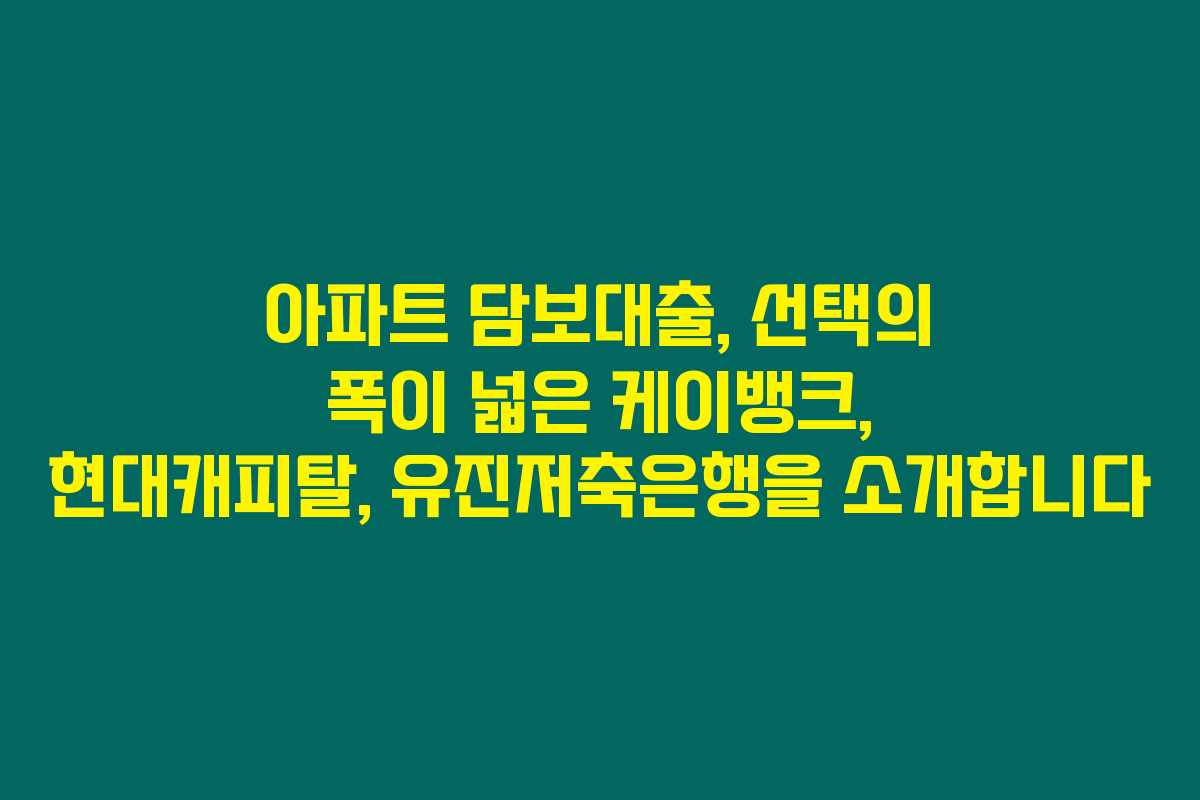 제가 직접 확인한 결과로는, 아파트 담보대출은 아파트를 소유한 분들에게 안정적인 자금 마련의 방법으로 많은 인기를 끌고 있어요. 특히 케이뱅크, 현대캐피탈, 유진저축은행에서는 각기 다른 조건과 금리로 아파트 담보대출 상품을 제공하고 있답니다. 아래를 읽어보시면 각 기관의 특징과 조건을 한눈에 비교할 수 있을 거예요.