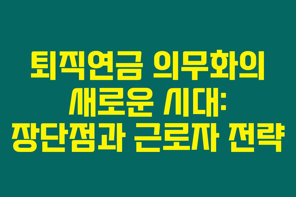 제가 직접 알아본 바로는 퇴직연금 의무화가 다가오는 시점에서 근로자들에게 큰 변화를 예고하고 있습니다. 고령화 사회를 대비하고 퇴직금의 안정된 관리를 위해 시행되는 이 제도는 여러 장단점을 가지고 있습니다. 아래를 읽어보시면 퇴직연금 의무화가 무엇인지, 그 장단점은 무엇인지, 그리고 근로자들이 어떻게 대응할 수 있는지에 대해 자세히 알아보실 수 있습니다.