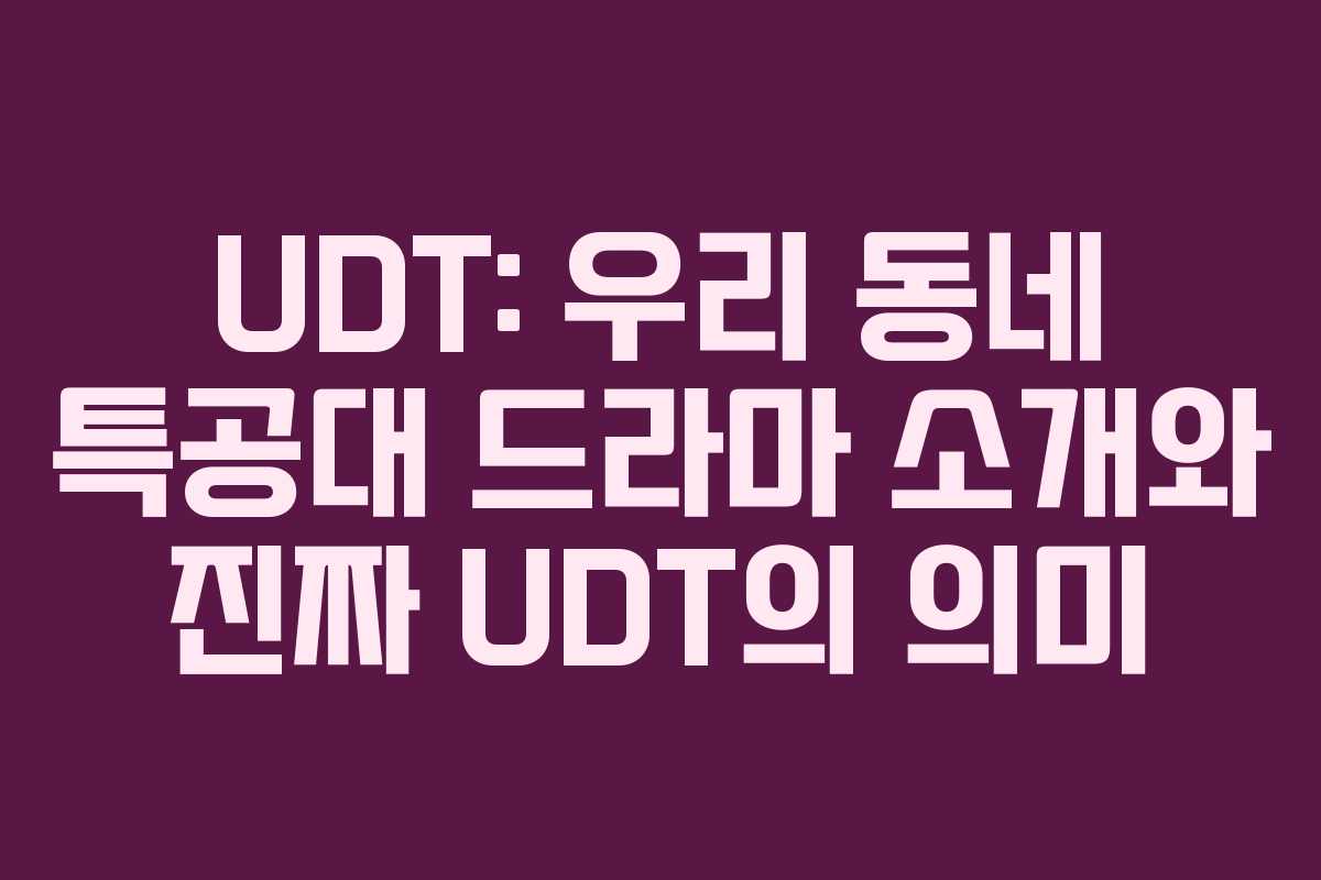 드라마 제목 속 ‘UDT’는 단순히 ‘우리 동네 특공대’를 의미하는 것이 아닙니다. 실제로 ‘UDT’는 특수부대 용어로, ‘Underwater Demolition Team’의 약자입니다. 이는 대한민국 해군을 포함하여 전 세계적으로 사용되는 용어입니다.